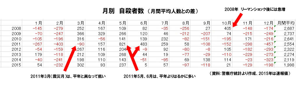 ちなみに、自殺者数について警察庁の統計で確認してみると、例年3月は自殺者数が年間で一番多い傾向があるのに対して、2011年だけは低い値となっていました。そのかわりに、5月、6月に大きく増えています。やはり、2011年の震災時には、平年と違う状況が起こっていたようです。